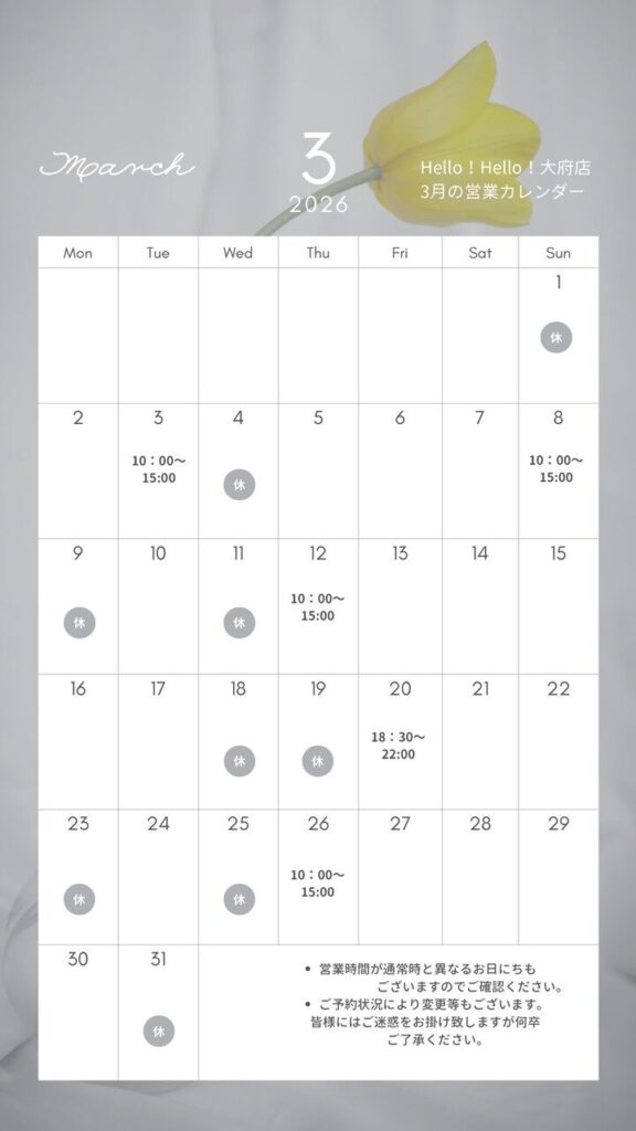 大府店より、今月の営業日および営業時間についてご案内申し上げます。
